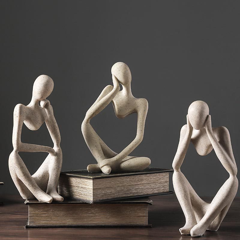 This statue shows a seated human figure with a hollow center and a hand resting on the head, symbolizing reflection and creativity. The design encourages interpretation and adds a calm and thoughtful element to any space.