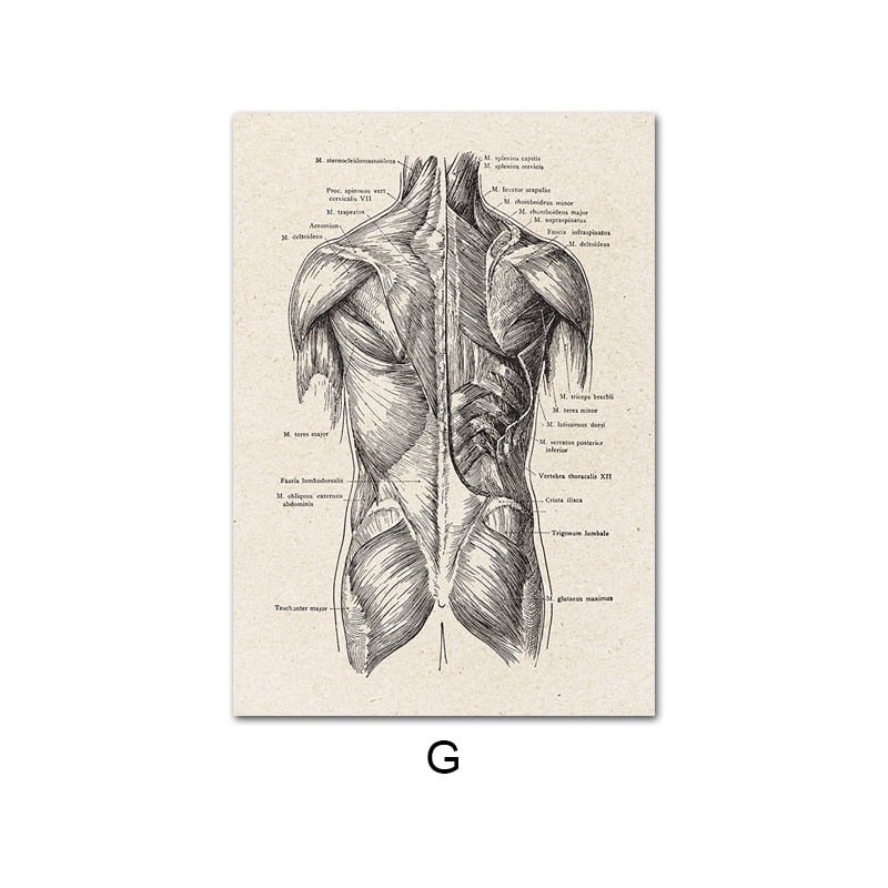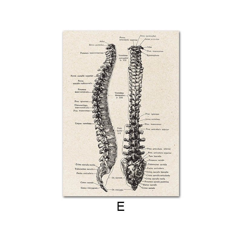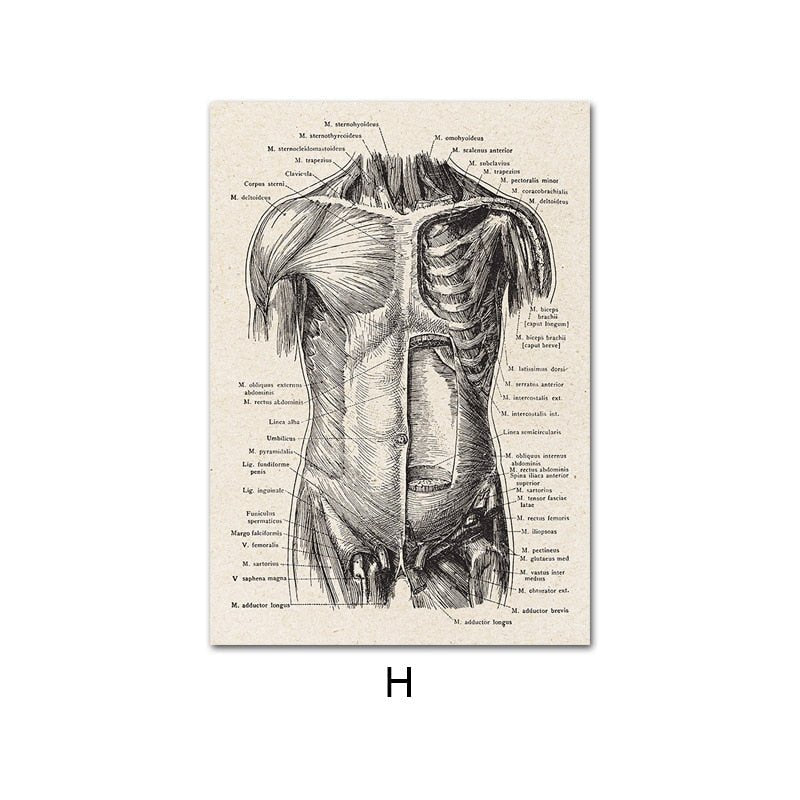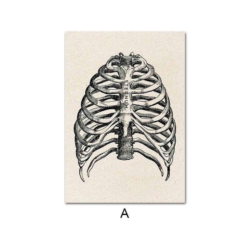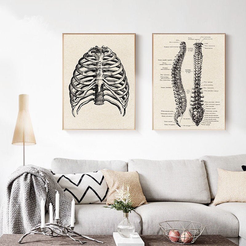 Human Anatomy Canvas Wall Art presents detailed illustrations of the human form, inspired by traditional anatomical drawings. The artworks depict structures such as the ribcage, spine, heart, brain, and full skeletal and muscular systems. Each piece highlights precise line work and proportion, emphasizing both the scientific and artistic aspects of the subject.