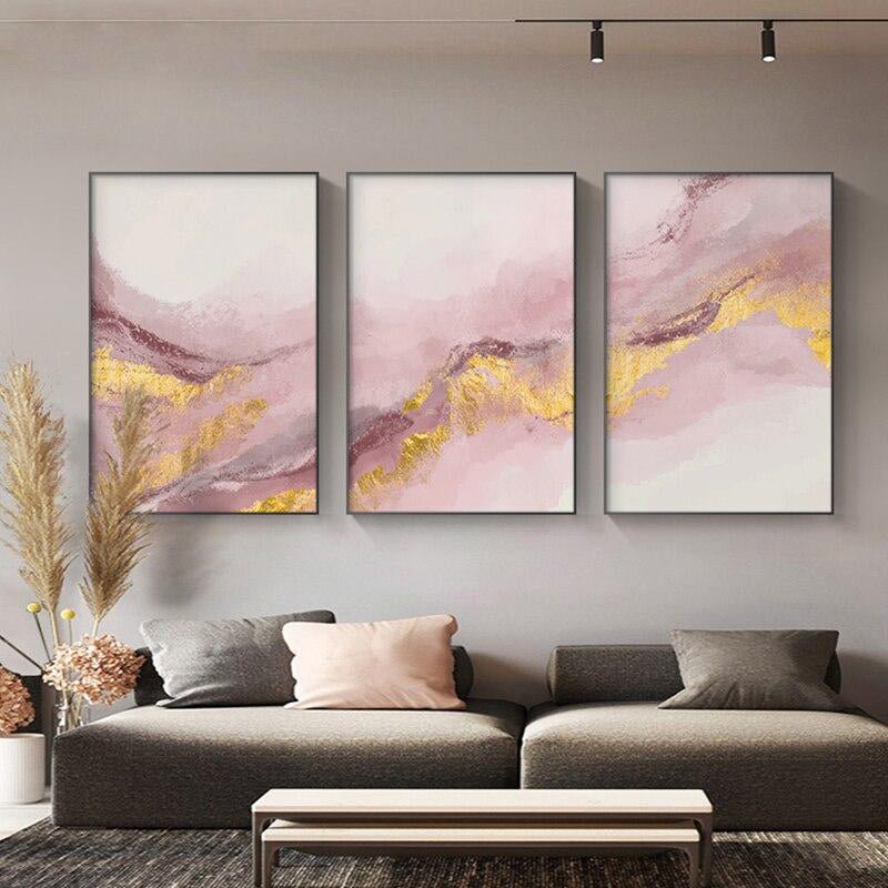 These pieces work well in bedrooms, living areas, or other spaces where a relaxed atmosphere is desired. The combination of pink and gold complements neutral interiors and pairs effectively with grey or white walls. A simple frame can be added to define the edges and complete the presentation.